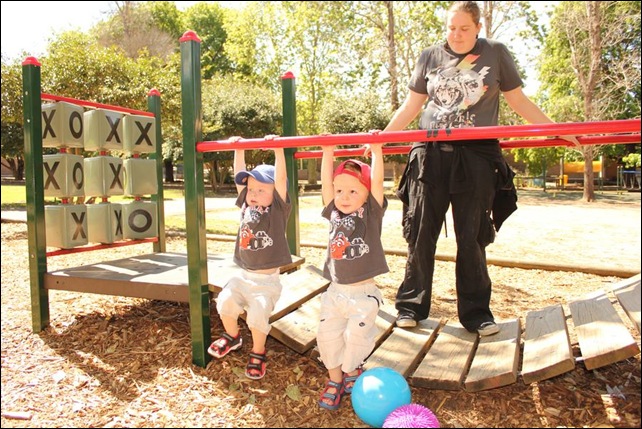 Last week we made the one hour drive to Aunty Linda’s house. We had a great day playing with her cat, in her yard and we went for a short walk to the local primary school. As it was school holidays (spring vacation) there was no kids around, and my little men got the playground all to them self!
